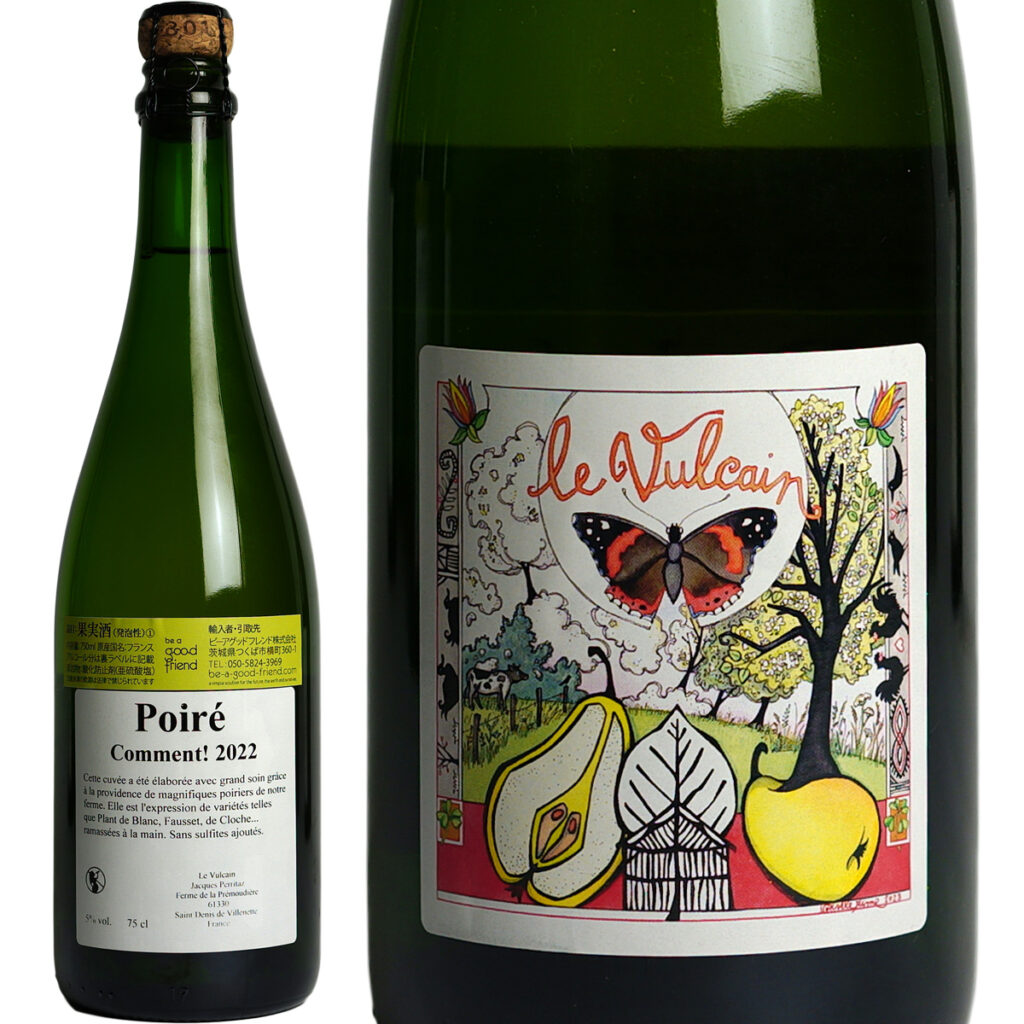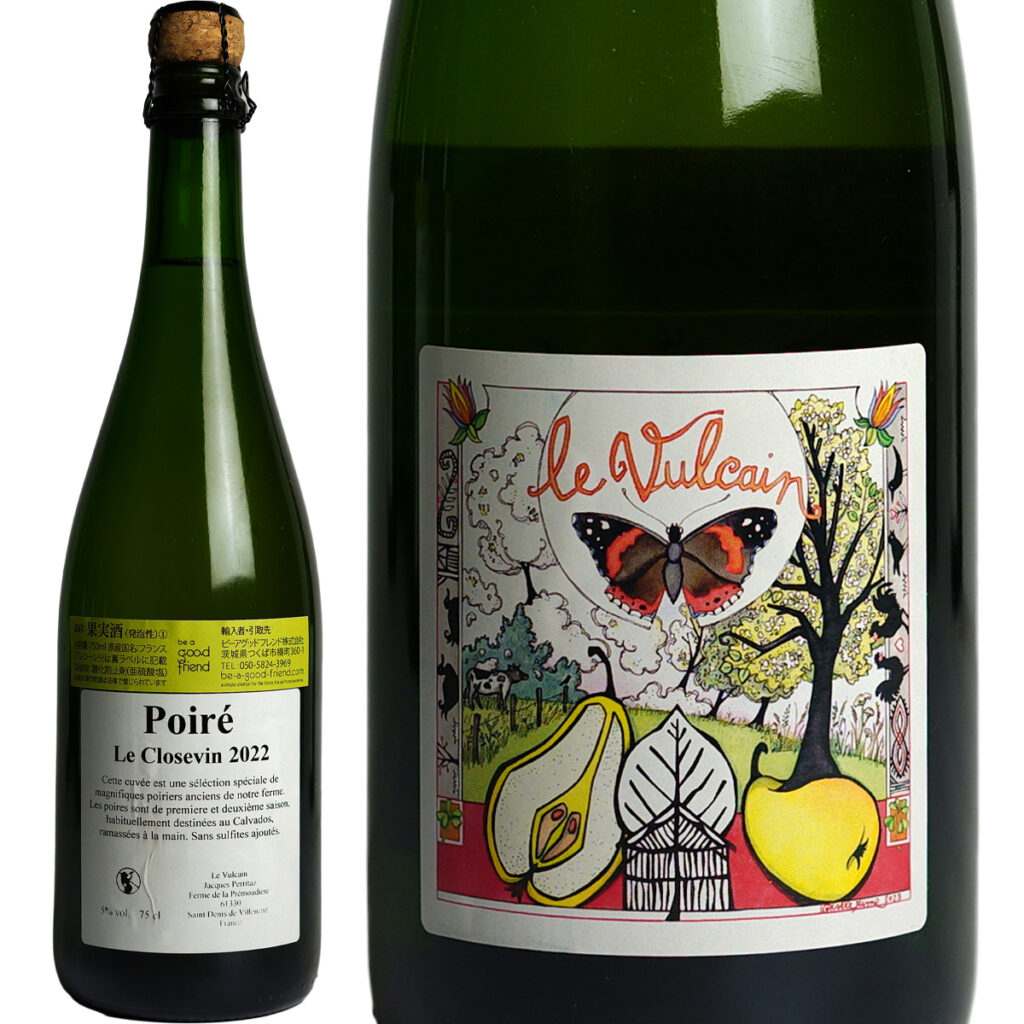 複数の洋梨を使用した、紅茶や香水のようなアロマティックな香りが特長の上品なポワレ。華やかで気品あふれる香りと、みずみずしい果実の旨味、ほのかな渋みが支えとなっており、全体のバランスが非常に良いのも魅力です。ボトルの後半になると、やや大きめの澱が濁りとともに見られるようになります。
